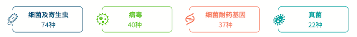 ☆ 廣譜:一次檢測完成74種細菌及寄生蟲、40種病毒、22種真菌、37種耐藥基因檢測;