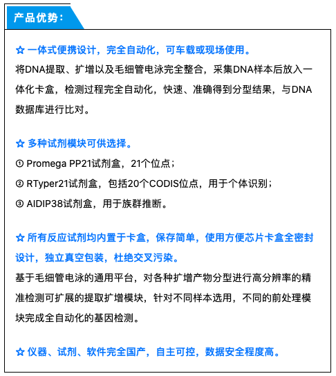 該系統(tǒng)基于微流控芯片技術,配套全集成芯片卡盒和數(shù)據(jù)分析軟件,集DNA提取、PCR擴增、毛細管電泳于一體,自動生成分型結果,2小時即可獲得DNA分型。既可用于重大事故、自然災害的人員身份快速識別和案件現(xiàn)場檢材的快檢快篩,也可用于邊防、公安等基層機關對敏感、可疑人員身份的快速識別和排查。儀器操作簡單便捷,無需專業(yè)技術人員操作,可檢測的樣本包括:血卡、唾液卡、口腔拭子卡等。無使用環(huán)境要求,既可在實驗室、辦公室、窗口單位,也可與警用現(xiàn)勘車配套移動式檢測,具有良好的抗震性、防污染措施,使用無需校準。同時兼容多款國內(nèi)外DNA試劑,具備個體識別和族群推斷功能。