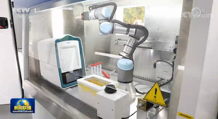 全集成新冠檢測移動實驗室接通220V民用電即可正常工作,同時它自身配備發(fā)電系統(tǒng)。采樣可以通過機械手和人工兩種方式完成,病毒滅活、核酸分析都無需人工干預自動完成。操作人員只需要做一個動作,就是用移液槍將滅活后試管內(nèi)的樣本加入到芯片里封閉,放入全自動微流控核酸分析儀中進行檢測,45分鐘后車內(nèi)的電腦顯示屏上就會自動顯示結果。
