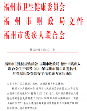 福州市新生兒耳聾基因篩查項目將在5月1日于指定采血機構(gòu)全面展開,篩查對象為在福州市指定采血機構(gòu)出生的常住人口新生兒(篩查對象需提供父母一方的身份證、戶口簿或居住證復(fù)印件),采用耳聾基因芯片檢測技術(shù),對新生兒四個常見耳聾基因的15 個突變位點進行檢測。聯(lián)合物理聽力篩查,準(zhǔn)確做出耳聾病因分析,提出早期干預(yù)措施,減少聽力疾病兒童的發(fā)生率,真正實現(xiàn)“早發(fā)現(xiàn)、早診斷、早干預(yù)”,達到有效預(yù)防出生缺陷的目標(biāo),減輕家庭和社會負(fù)擔(dān),促進社會和諧發(fā)展。