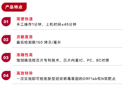 基于全新一代先進(jìn)的芯片實(shí)驗(yàn)室(Lab-on-a-chip)設(shè)計(jì)理念,化繁為簡(jiǎn),檢測(cè)時(shí)僅需將樣本保存液加入芯片,封閉芯片后即可上機(jī),手工操作小于1分鐘。生物反應(yīng)全程(包括核酸提取、核酸純化、擴(kuò)增反應(yīng)、核酸檢測(cè)和結(jié)果判讀等)均集成在一個(gè)整體密閉、內(nèi)部分區(qū)的微流控芯片內(nèi),由全自動(dòng)核酸分析儀完成,因此無(wú)需專(zhuān)業(yè)分區(qū)實(shí)驗(yàn)室,無(wú)需人工干預(yù),最大程度降低操作人員感染及樣本間交叉污染的風(fēng)險(xiǎn)。45分鐘完成實(shí)驗(yàn)全過(guò)程,最快可在35分鐘內(nèi)檢出新冠陽(yáng)性樣本,檢測(cè)靈敏度可達(dá)150拷貝/毫升,在截至目前國(guó)內(nèi)獲批的同類(lèi)產(chǎn)品中靈敏度最高,真正實(shí)現(xiàn)“樣本進(jìn)-結(jié)果出”。