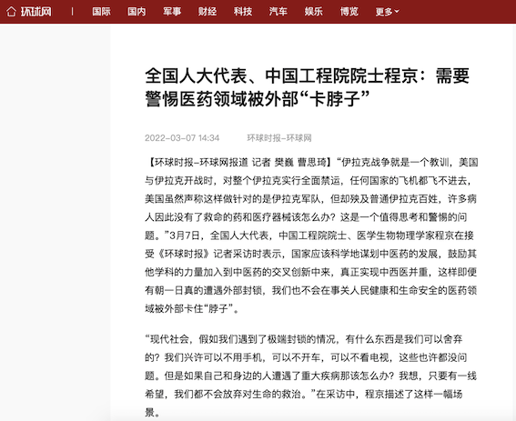 “伊拉克戰(zhàn)爭就是一個(gè)教訓(xùn),美國與伊拉克開戰(zhàn)時(shí),對整個(gè)伊拉克實(shí)行全面禁運(yùn),任何國家的飛機(jī)都飛不進(jìn)去,美國雖然聲稱這樣做針對的是伊拉克軍隊(duì),但卻殃及普通伊拉克百姓,許多病人因此沒有了救命的藥和醫(yī)療器械該怎么辦?這是一個(gè)值得思考和警惕的問題?!?月7日,全國人大代表,中國工程院院士、醫(yī)學(xué)生物物理學(xué)家程京在接受《環(huán)球時(shí)報(bào)》記者采訪時(shí)表示,國家應(yīng)該科學(xué)地謀劃中醫(yī)藥的發(fā)展,鼓勵(lì)其他學(xué)科的力量加入到中醫(yī)藥的交叉創(chuàng)新中來,真正實(shí)現(xiàn)中西醫(yī)并重,這樣即便有朝一日真的遭遇外部封鎖,我們也不會(huì)在事關(guān)人民健康和生命安全的醫(yī)藥領(lǐng)域被外部卡住“脖子”。
