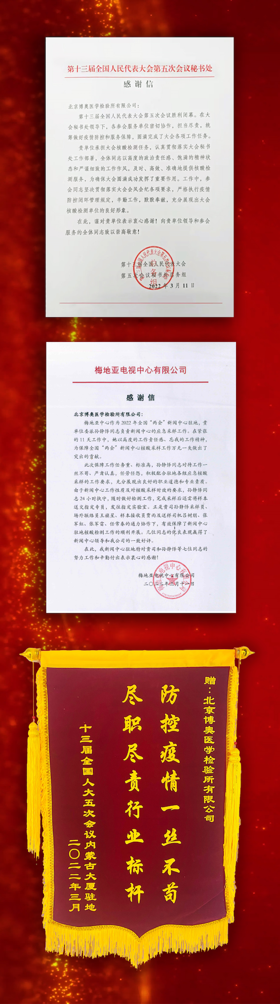 為此,博奧晶典旗下北京博奧醫(yī)學檢驗所收到了來自全國人大第五次會議秘書處、全國兩會新聞中心駐地梅地亞電視中心的感謝信及全國人大五次會議內蒙古大廈駐地的致敬錦旗。