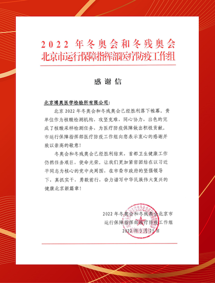 作為戰(zhàn)疫國家隊成員,在此次北京冬奧會和冬殘奧會期間,博奧晶典承擔了為來自世界各地的國家元首、政府首腦、王室成員和國際組織負責人等重要來賓提供實時就地核酸檢測以及人員和環(huán)境樣本的核酸檢測任務,以硬核“芯”科技賦能奧運,收獲了來自冬奧會和冬殘奧會北京市運行保障指揮部醫(yī)療防疫工作組的感謝、表揚和點贊。