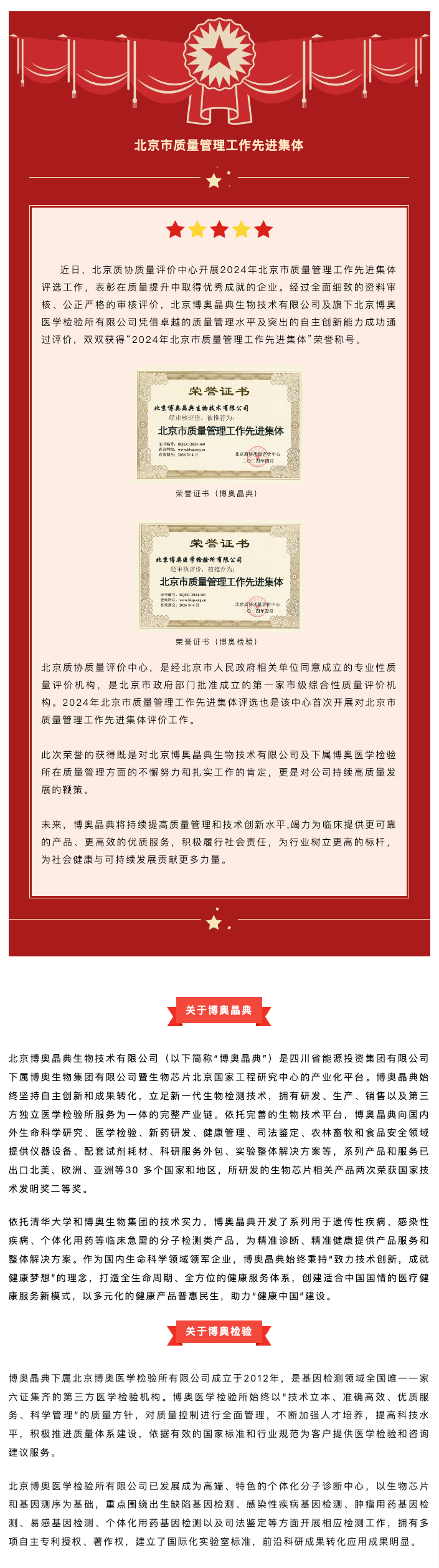 喜訊丨北京博奧晶典生物技術(shù)有限公司、北京博奧醫(yī)學(xué)檢驗(yàn)所有限公司雙雙獲評(píng)“北京市質(zhì)量管理工作先進(jìn)集體”