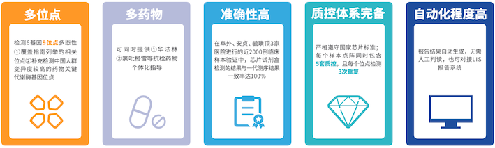 抗栓治療用藥相關(guān)6個基因位點(diǎn)多態(tài)性檢測試劑盒(微陣列芯片法)采用多重等位基因序列特異性PCR結(jié)合通用微陣列芯片(Allele-Specific PCR-based Universal Array,ASPUA)方法,對人基因組DNA中VKORC1、CYP2C9、CYP4F2、GGCX、CYP2C19和CYP3A4這6個基因的9個多態(tài)性位點(diǎn)進(jìn)行檢測。